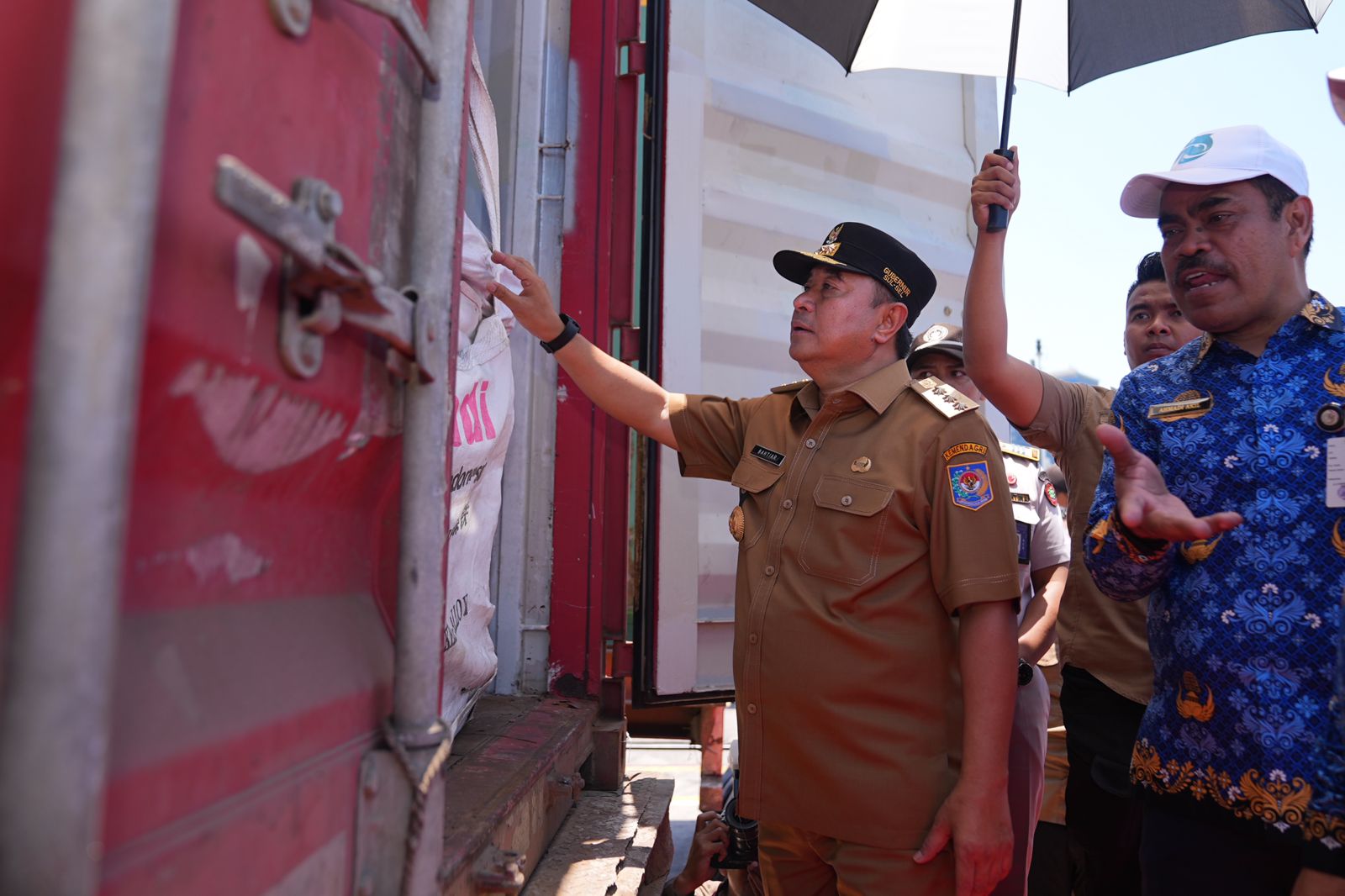 MM, MAKASSAR —  Penjabat Gubernur Sulsel, Bahtiar Baharuddin, melepas ekspor sejumlah komoditi unggulan asal Sulsel dengan nilai ekspor Rp1,64 triliun, di Pelabuhan Petikemas, Makassar, Selasa, 17 Oktober 2023. Produk unggulan tersebut diekspor ke 29 negara tujuan, terutama ke Shanghai China.
