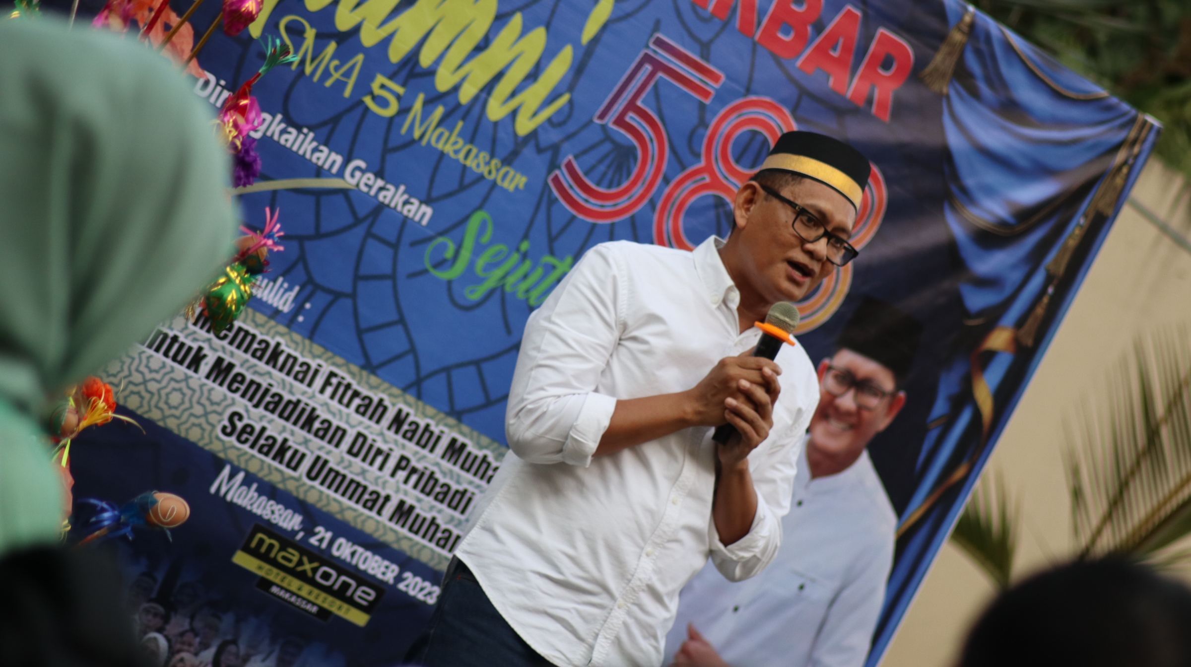 MM,MAKASSAR — Ikatan Keluarga Alumni (IKA) SMA 5 Makassar angkatan tahun 88 menggelar peringatan maulid Nabi Muhammad SAW di Hotel Maxone, Kota Makassar, Sabtu 21 Oktober 2023. Kegiatan tersebut menghadirkan Ustad Kondang Nur Maulana.