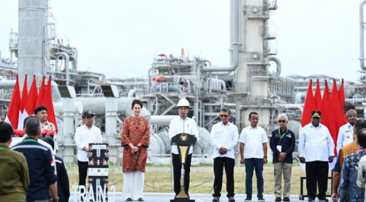 MM,PAPUA BARAT — Presiden Joko Widodo meresmikan Proyek Strategis Nasional (PSN) Tangguh Train 3, di Kabupaten Teluk Bintuni, Provinsi Papua Barat, pada Jumat, 24 November 2023. Presiden menyebut hasil produksi dari proyek tersebut dapat meningkatkan kapasitas produksi tahunan Tangguh LNG menjadi 11,4 juta ton per tahun.