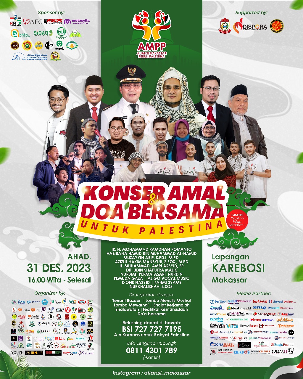 Makassar,MM- Puluhan komunitas dan lembaga se-Makassar beraliansi untuk memberi dukungan ke Palestina. Aliansi ini dinamai AMPP (Aliansi Makassar Peduli Palestina). AMPP nanti akan melaksanakan sebuah kegiatan besar yang dinamai Konser Amal dan Doa Bersama untuk Palestina. Konser tersebut dilaksanakan pada tanggal 31 Desember 2023 di Lapangan Karebosi, Makassar.