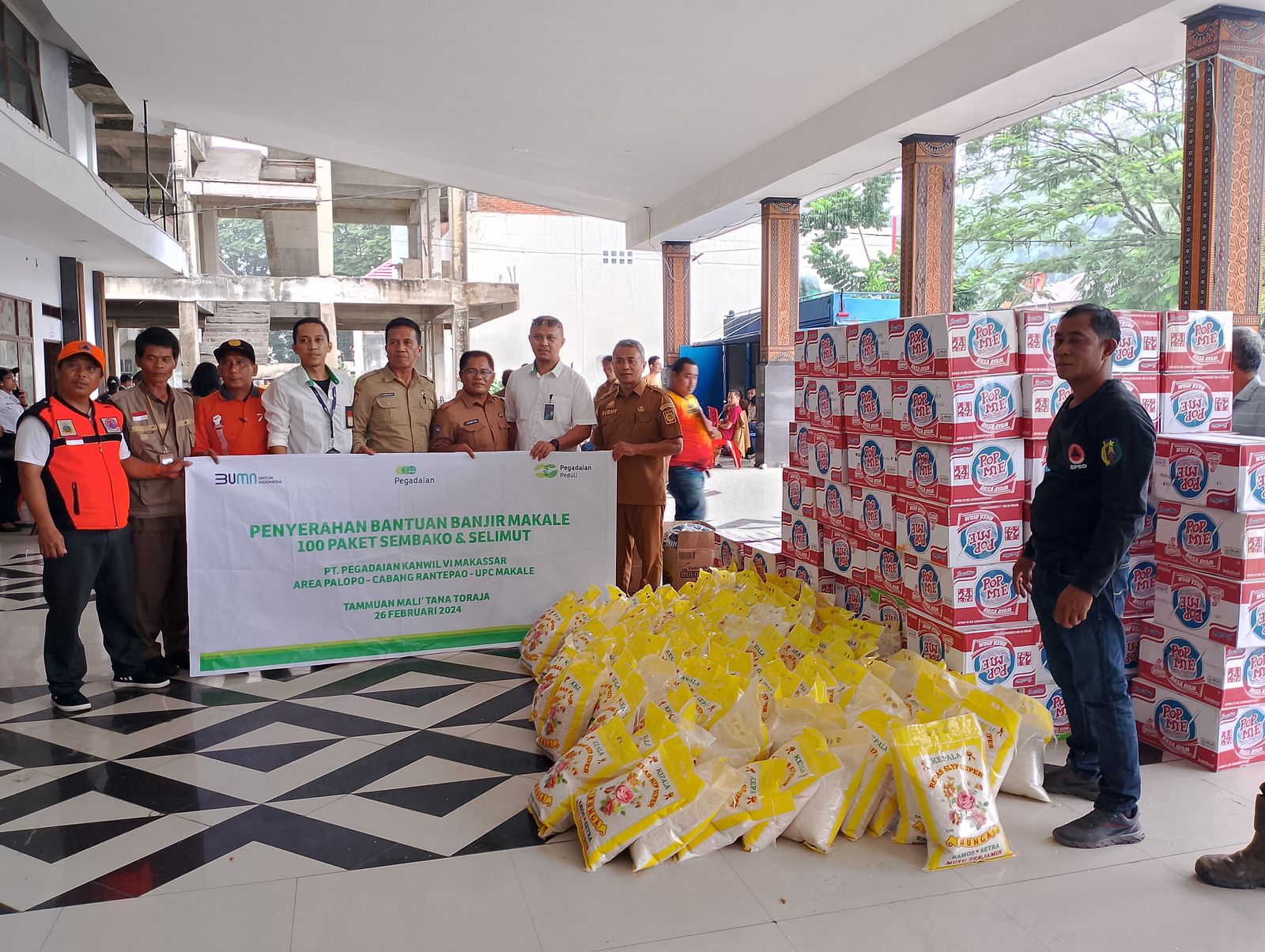 Bantuan tersebut diserahkan oleh Pegadaian Kanwil Makassar yang diwakili oleh Pemimpin Cabang Pegadaian Rantepao dan diterima oleh Sekertaris Daerah Kab. Tana Toraja didampingi oleh Kepala Dinas Sosial dan Kepala Badan Penanggulangan Bencana Daerah (BPBD) Kab. Tana Toraja pada hari Senin (26/2/2024).