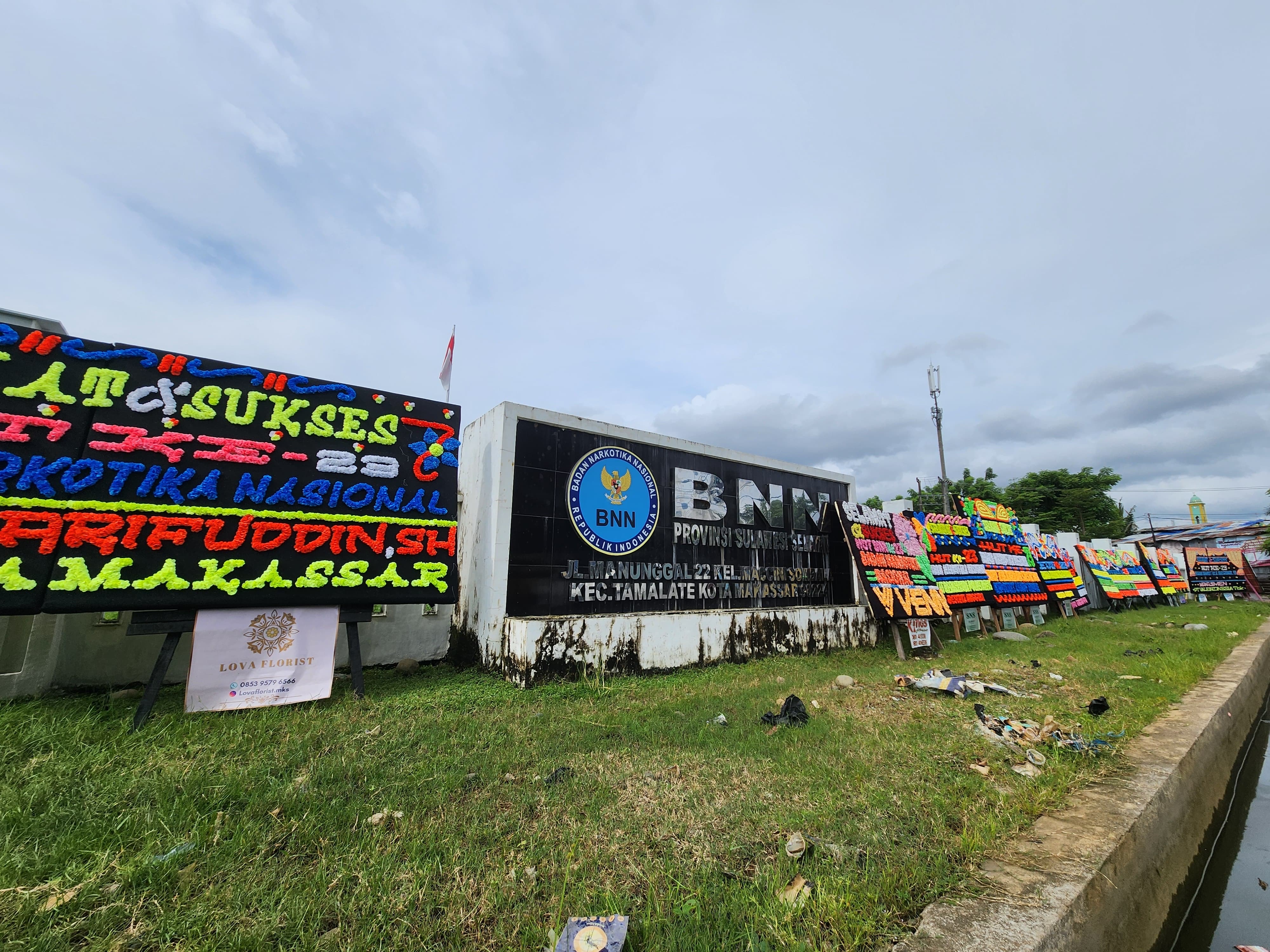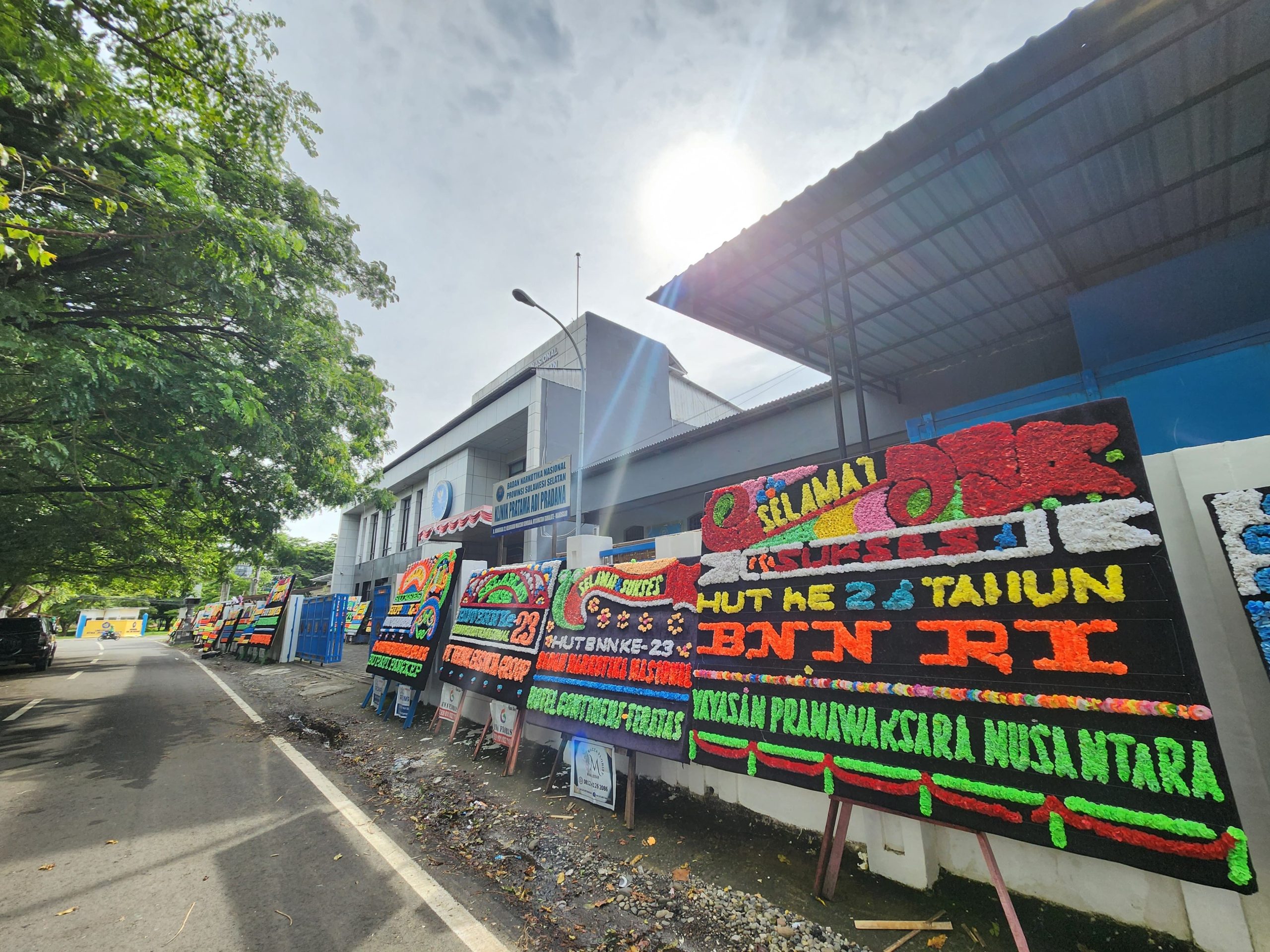 kantor BNNP Sulawesi Selatan dibanjiri karangan bunga sebagai bentuk dukungan dan apresiasi dari segenap Institusi, Lembaga serta masyarakat Sulawesi Selatan pada peringatan HUT BNN ke 23 Tahun 2025 dalam memerangi narkoba guna mewujudkan Indonesia Bersinar (bersih dari narkoba).