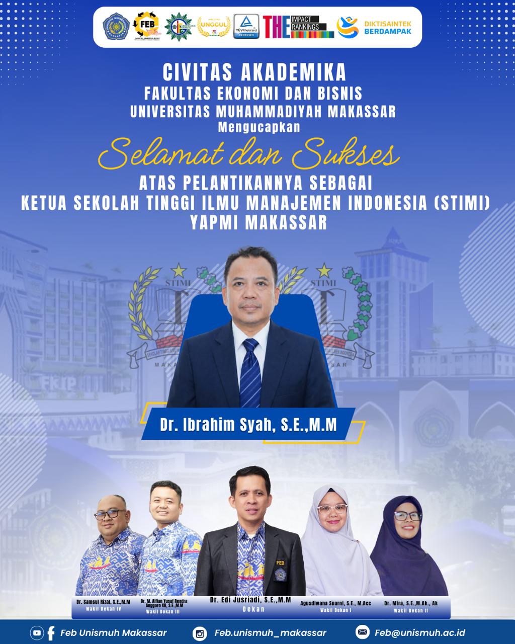 Makassar, MM – Pengurus Pusat DPP Ikatan Alumni Universitas Muhammadiyah (IKA Unismuh) Makassar bersama Civitas Akademika Fakultas Ekonomi dan Bisnis (FEB) Universitas Muhammadiyah Makassar menyampaikan ucapan selamat dan sukses atas pelantikan Dr. Ibrahim Syah, S.E., M.M sebagai Ketua Sekolah Tinggi Ilmu Manajemen Indonesia (STIMI) YAPMI Makassar.